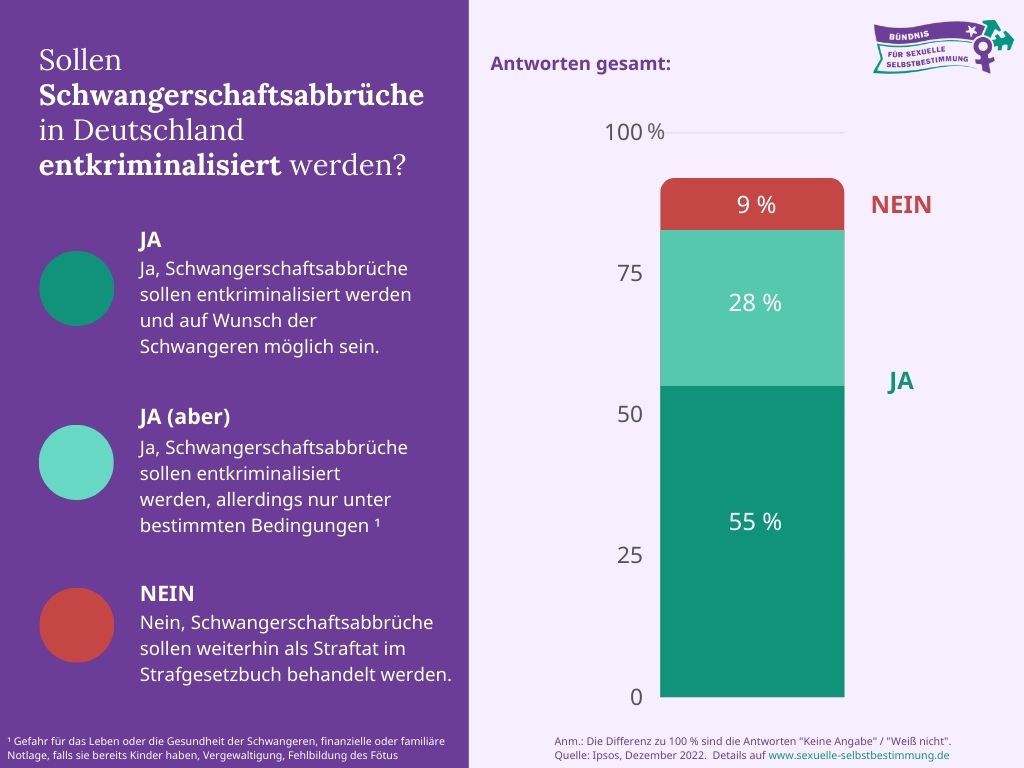Dabei steht mit 55 Prozent über die Hälfte der Bevölkerung hinter dem Recht auf sexuelle Selbstbestimmung und der ersatzlosen Streichung der Paragrafen 218 ff. und fordert, dass die Entscheidung für einen Abbruch allein bei der Frau bzw. schwangeren Person liegen sollte.